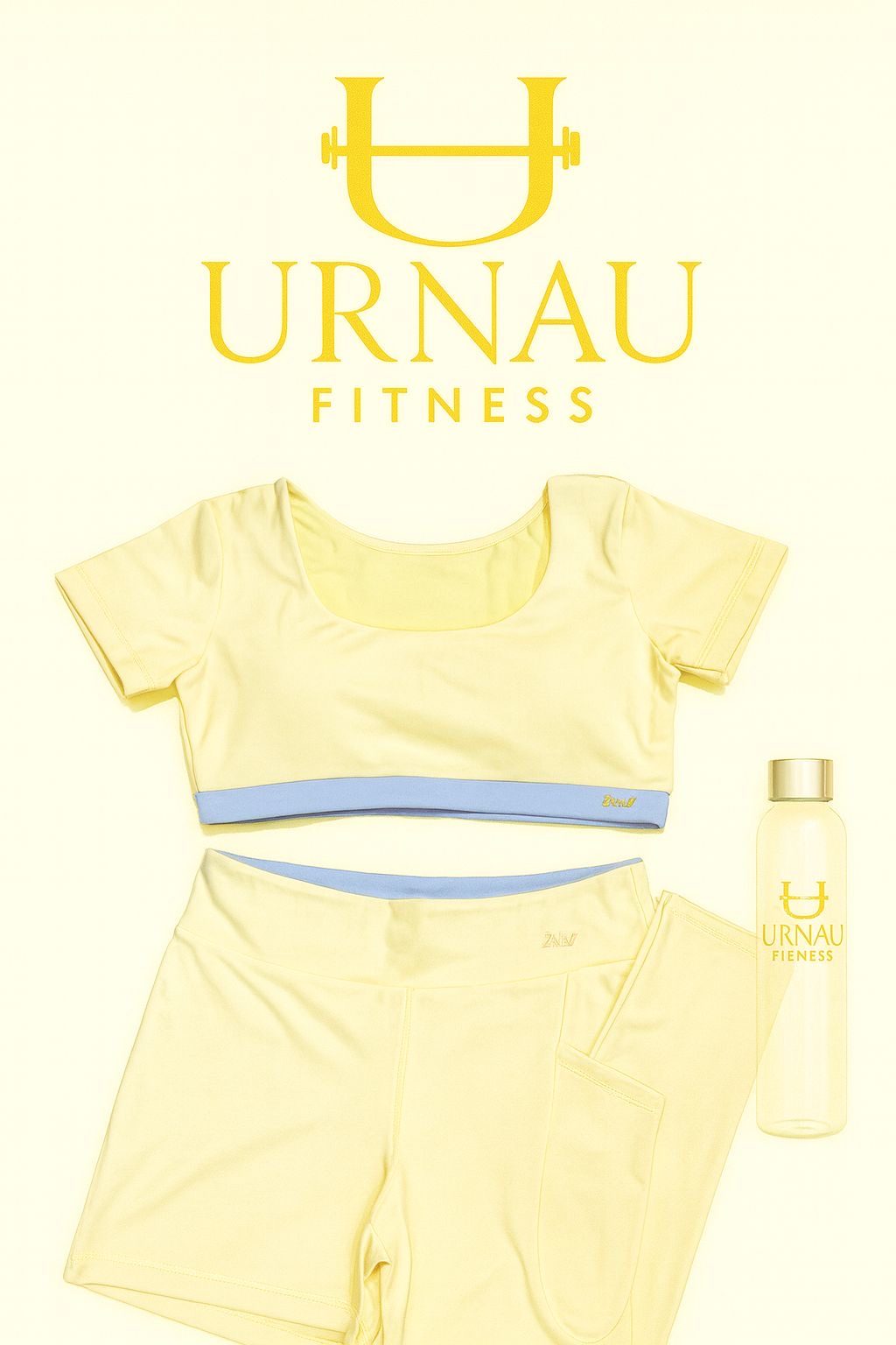 Conjunto de calça com bolso lateral e Cropet - poliamida- Amarelo manteiga com azul- tamanho: 36/42-